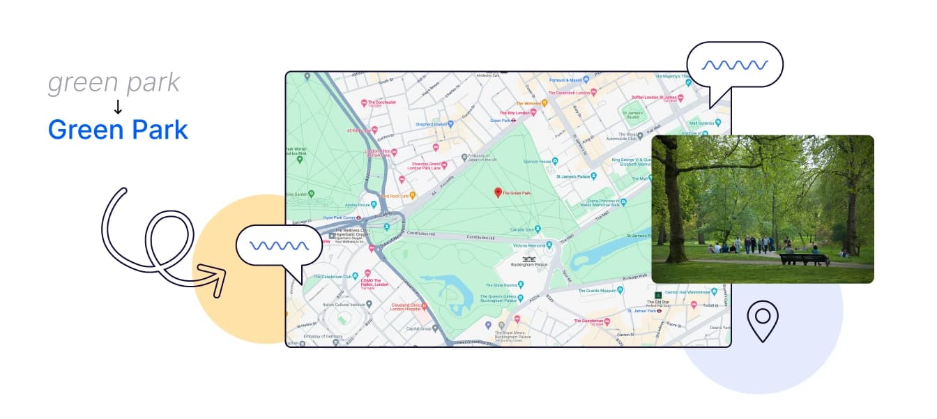 Once the sentence has been entirely transcribed, further context can be derived – Green Park is not simply a park that is green in London, it is a place, so this might be amended to: