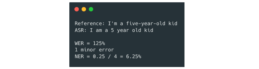 Using the same examples as in the previous blog in the series, let’s see what NER comes out with. For the first, a minor recognition error would be assigned to outputting ‘I am’ instead of ‘I’m’ since you can easily read through it. The errors from ‘five-year-old' are only because of a difference in specification, so there is no penalty assigned here. The NER equals 6.25%.