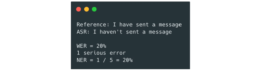 For the second, there’s a serious error assigned to incorrectly transcribing the word “have” to “haven’t”. The NER is 20%. Note the penalties assigned are subjective and different people might rate this differently.